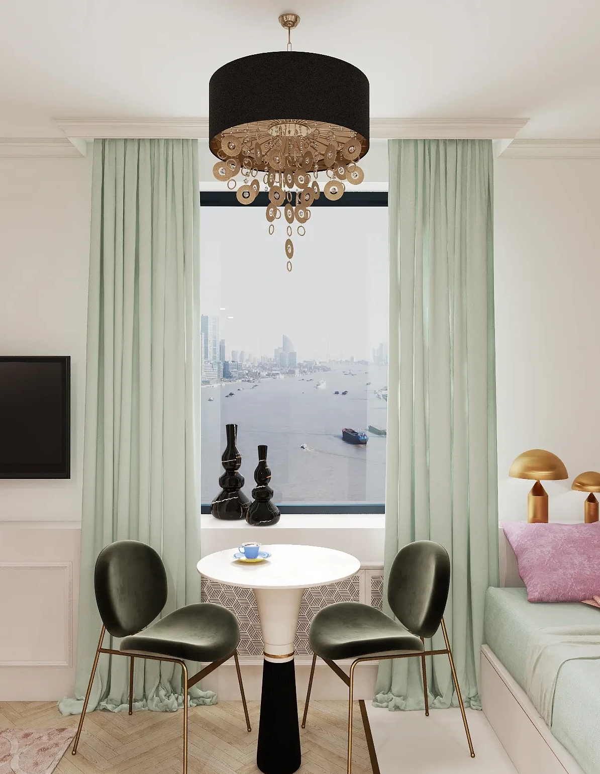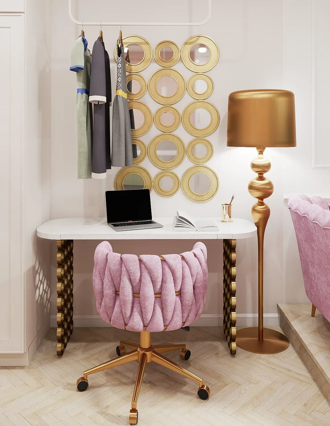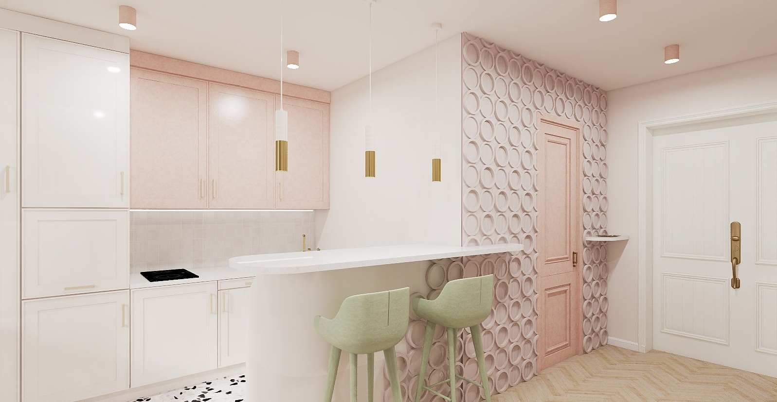 Bathed in soft light and shades of morandi rose, the studio radiates gentle elegance. Delicate contrasts of blush tones, sage, and apricot are accented with touches of gold and marble, adding a playful hint of luxury. The space feels light and feminine — graceful, vibrant, and full of charm, with every detail thoughtfully designed to enhance its inviting atmosphere.
